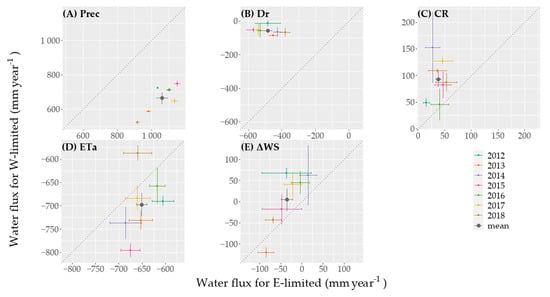 Comparison of the annual water balance components for lysimeters with soils from Rollesbroich located in the energy-limited site Rollesbroich (E-limited, x-axis) and the water-limited site Selhausen (W-limited, y-axis) for (A) precipitation (Prec), (B) drainage (Dr), (C) upward directed water mimicking capillary rise (CR), (D) actual evapotranspiration (ETa), and (E) the resulting soil water storage (ΔWS). Positive values represent an input and negative values a loss of water for the soil lysimeter system. “mean” in the legend indicates the mean annual values for the period 2012–2018 and the inter-annual variability is represented by the standard error of annual means.