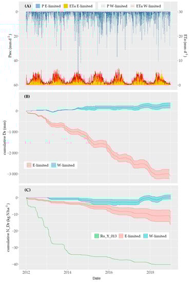 For the period between 2012 and 2018 in Selhausen, the water-limited site (W-limited) and Rollesbroich, the energy-limited site (E-limited), (A) daily precipitation (Prec) and actual evapotranspiration (ETa), (B) cumulative net drainage (Dr), (C) cumulative net leached nitrogen (N_Dr). For (B) and (C), the colored areas represent the standard deviation to the mean value of each study site. For (C), because E-limited Ro_Y_013 behaved differently compared with the other E-limited lysimeters, its dataset is presented separately.