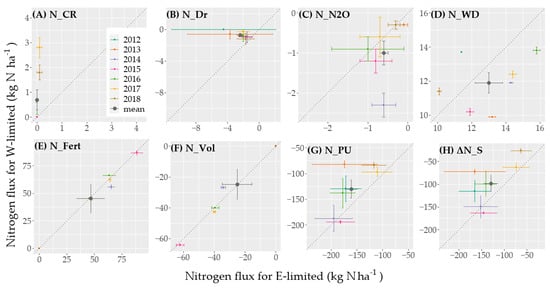 The different components of annual nitrogen balance for lysimeters from Rollesbroich in Rollesbroich the energy-limited site (E-limited, x-axis) and Selhausen the water-limited site (W-limited, y-axis) for (A) nitrogen in the upward directed water (N_CR), (B) nitrogen in drainage water (N_Dr), (C) nitrogen lost by N2O emissions (N_N2O), (D) nitrogen in wet deposition (N_WD), (E) nitrogen input by fertilizer (N_Fert), (F) ammonia volatilization of the fertilizer nitrogen (N_Vol), (G) plant nitrogen uptake (N_PU), and (H) the resulting soil nitrogen storage (ΔN_S). The negative values represent a nitrogen loss for the lysimeters; “mean” in the legend indicates the mean annual values for the period 2012–2018 and the inter-annual variability is represented by the standard error of annual means. There are gaps in the N2O emission data for the years 2013 and 2018 resulting in lower yearly emissions.