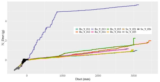In 2012 and 2013, the high concentration of nitrogen in Dr for E-limited Ro_Y_013 (Figure 3C and Figure 6) led to a higher average N_Dnet compared to other E-limited lysimeters (Figure 7). Because of this, there was a high standard deviation of the mean N-concentration for E-limited (Figure 8) in Dr. For E-limited Ro_Y_015, we observed a period of larger increase of N_Dnet between values of 900 mm to 1100 mm and around 3000 mm (Figure 7). Otherwise, this lysimeter did not show a different N_Dnet dynamic. Finally, we observe a high average N-concentration in Dr for 2015 compared with the other years (Figure 8).
