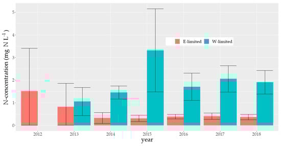 The N-concentration in Dr was not significantly higher for W-limited compared to E-limited in 2013. For 2014 onwards however, the confidence intervals—95% confidence level—of N-concentration in W-limited and E-limited do not overlap (Figure 8).