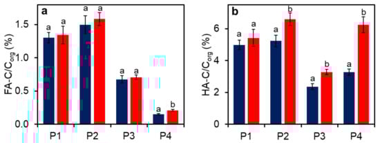 Concentration of FA-C (a) and HA-C (b) as a percentage of Corg in fresh (blue) and stored (red) sewage sludge samples. Different letters (a, b) refer to significant differences (HSD test, P < 0.05).