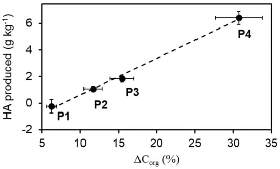 Amount of humic acid (HA) produced during storage as a function of the loss Corg (ΔCorg).