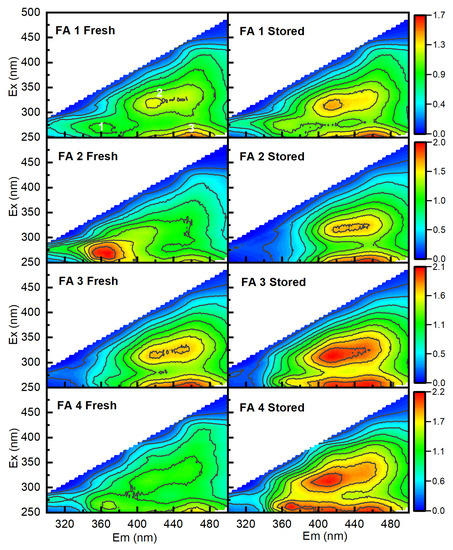 Comparing the EEM spectra of FA before and after storage in all samples, it is possible to observe that storage did cause increments in the intensity of peaks 2 and 3, with the only exception of the well-stabilized fresh sludge in P1, where no significant changes were observed.