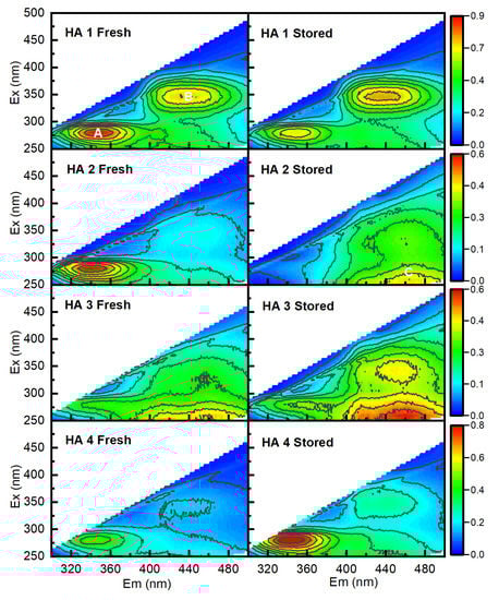 EEM features are often summarized and evaluated by calculating the Zsolnay humification index (HIX) [41]. HIX values are reported in Table 4 and increased after storage as a consequence of shifting of the emission spectra toward longer wavelengths (red-shifting of fluorescence emission) that occurs with humification and aromaticity degree [48,49,50].