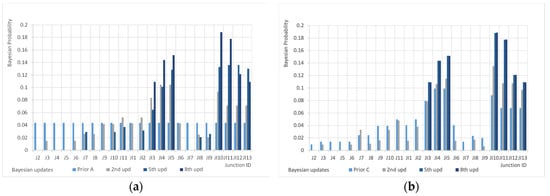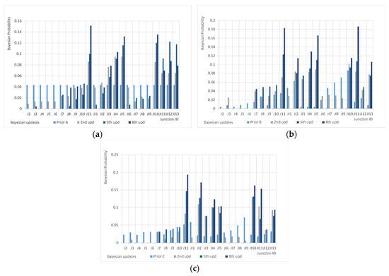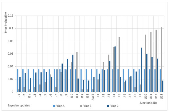Prior C provides another optimal configuration in which two sensors are located in the same nodes than Prior A (J11 and JI10) and the third one is in node JI2. Only one node is common between Prior B and Prior C (J11). Detection capacity drops to 78%, lower values of indicators F1 (61%) and F2 (78.2%) keeping F3 (76.8%) substantially at the same level of the previous case. In none of the cases, after 10 updates, the variation of posterior probability can be considered negligible demonstrating that some other steps may be needed to help the method to improve the selection of sensor locations.