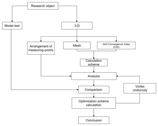 This paper takes the Exi River Flood Discharge Station in the Anhui Province as the research object, improves and optimizes the hydraulic performance of the forebay in the original design plan based on the improved volume of fluid (VOF) model combined with a three-dimensional turbulence numerical model and a physical model test, and explores the combined strategy of a diversion wall, a rectifier sill, and a rectifier pier to control the flow field in the forebay of the pumping station under various conditions by the CFD method. The analysis method and procedure are shown in Figure 1.