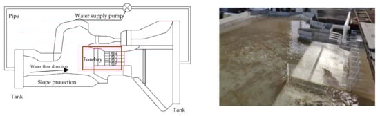 The first step in numerical simulation is the modeling of three-dimensional entities. It is an important factor affecting the lattice division and the accuracy of the final research results whether the model is accurate or not [,]. After the model is established, the three-dimensional boundary conditions are compared with references [] as the flow velocity and pressure of the inlet are unknown before working out the equation. When load rejection units happen, the inlet boundary is set as the hydrostatic pressure boundary, the outflow boundary—as the velocity boundary, model flow rate is 76 m3/h, i.e., 0.0211 m3/s. The numerical simulation area is shown in Figure 4, and enlarged details of the forebay are shown on the right.