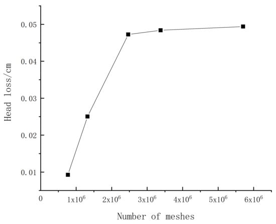 A reasonable number of computational cells can ensure the accuracy of the calculation and greatly improve the efficiency of the calculation. In order to obtain reliable numerical simulation results while minimizing the computational workload, an independent analysis of the number of cells required for calculation is required. The simulation is based on the Flow-3D software, and the computational grid is Cartesian. In order to better capture the velocity gradient at the edge, the wall and the deflector on the left and right sides of the forebay are nested, and the fine mesh with the side length of 0.25 D is used for refinement. D is the side length of the main mesh. In this regard, hydraulic losses are taken as characteristic parameters to determine the appropriate grid. References [,,] are used to calculate hydraulic losses: