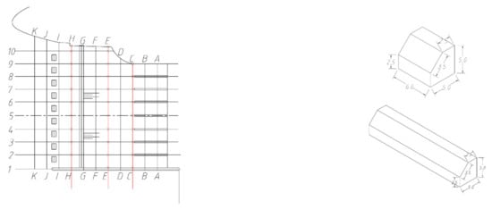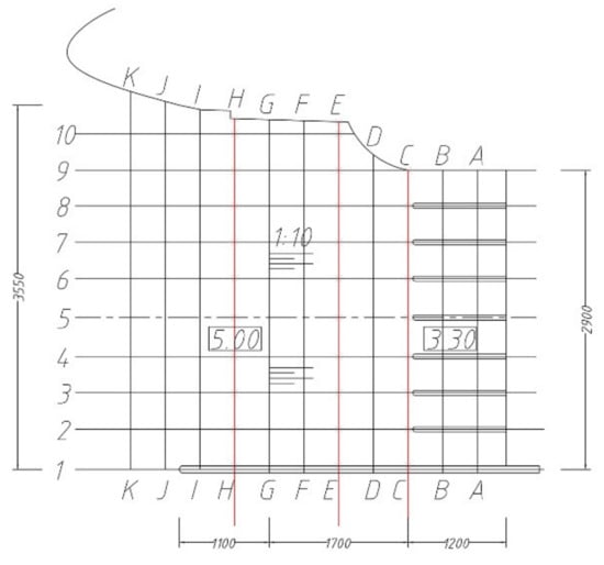In order to quantitatively compare the influence of rectification measures on the flow pattern of intake water, the velocity distribution of three sections (C, E, H) in the intake forebay of the pumping station is determined in the calculation. The position of the section is shown in the Figure. With the reference [] method, 8–10 measuring lines were arranged in each section, and the position is shown in Figure 6; in this Figure, 5.00 and 3.30 are the bottom elevation of the forebay, and 1.1 is the slope. Three measuring points were taken for each line, 0.3 h, 0.6 h, and 0.9 h, respectively, where h is water depth. The location of measuring points is shown in Figure 7.