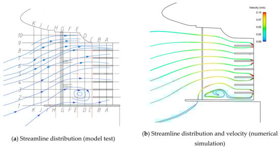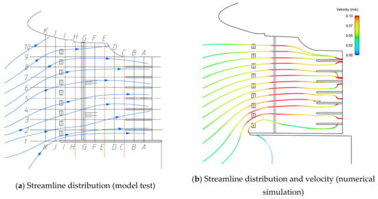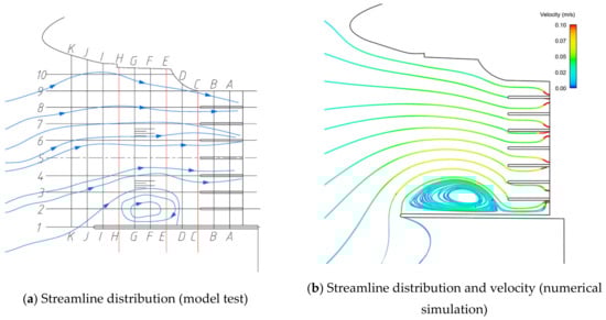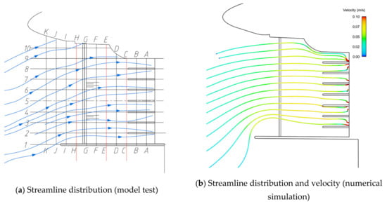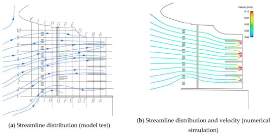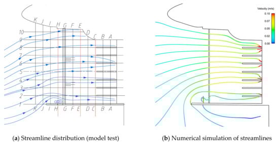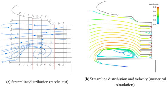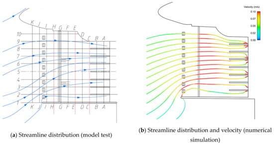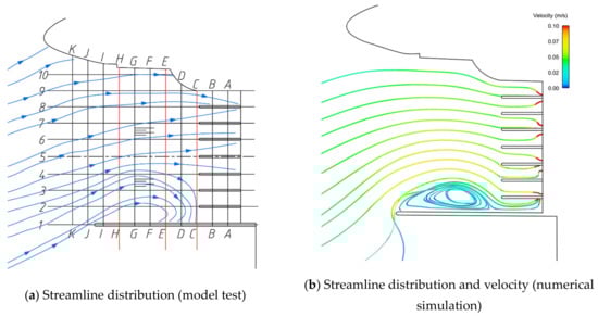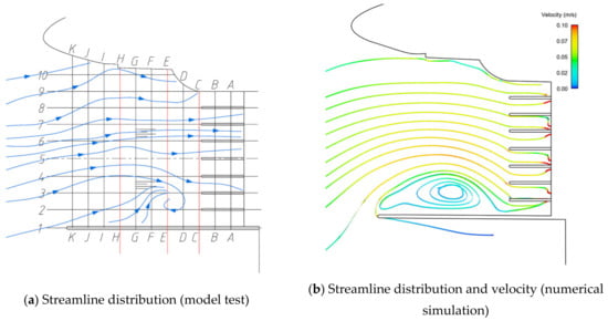 The rectifier sill is added as a rectifying measure (Figure 18). Because the water flow on the backside of the sill whirls and produces a small vortex area [,], once the water flows through the sill, it forms a constant vortex [] due to the separation of water flow so as to achieve the purpose of energy dissipation and improvement of the flow pattern. Under the design operating conditions, the flow pattern of the forebay is obviously improved and the vortex on the right bank of the original forebay disappears by setting a rectifier at the entrance section of the forebay.