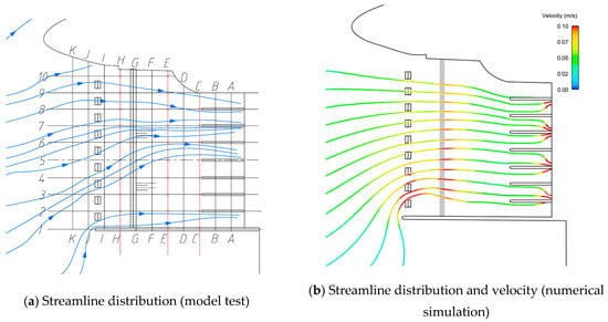 The results show that the flow pattern in plan 7 is relatively smooth and the uniformity of flow velocity is 5.5%, 6.2%, and 20.2% higher in sections C, E, and H than in the original plan, respectively. The uniformity of flow velocity is improved significantly.