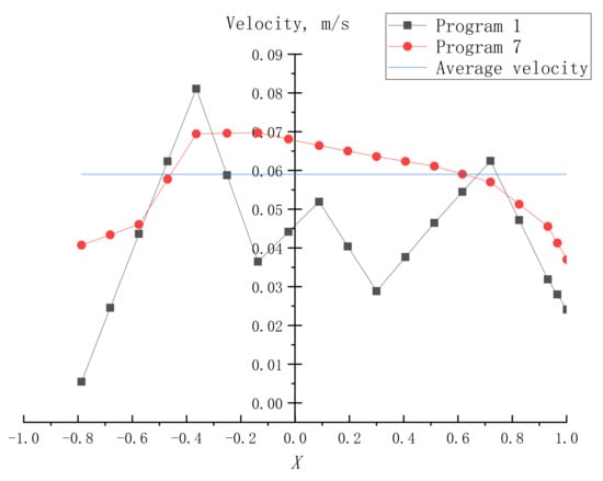 The results are shown in Figure 25. X is a dimensionless number referring to the relative position, ; l is the pumping station inlet width, m; x is the coordinate of the measurement point with the central axis as the origin, m.