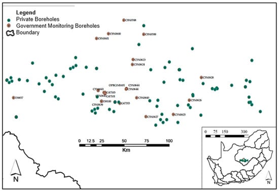 The Modder River catchment has both private boreholes and government monitoring boreholes. The study looked at the private boreholes whose owners gave consent. The private boreholes were of interest because the government is not in a position to monitor them. However, both private and government boreholes were used for the study. A monitoring system for all boreholes in the catchment is yet to be established [9]. The C52 catchment is further sub-divided into drainage regions: C52A to C52J. Figure 2 shows the boreholes available in the study area. The boreholes include both government monitoring boreholes (orange) and private boreholes (green).