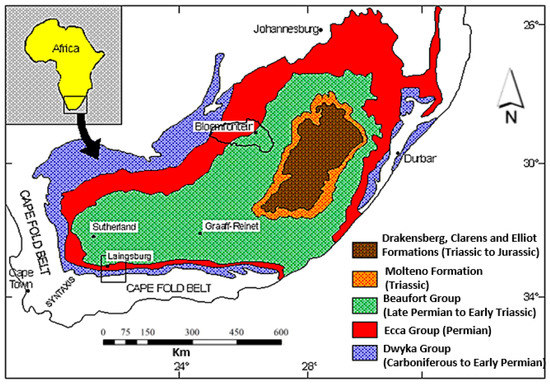 - Veevers, J.J.; Cole, D.I.; Cowan, E.J. Southern Africa: Karoo Basin and Cape Fold Belt. Geol. Soc. Am. Mem. 1994, 184, 223–280. [Google Scholar] [CrossRef]