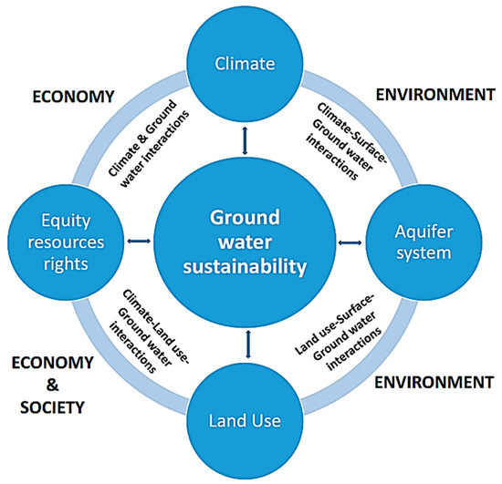 Sustainability in this context is a summative outcome of the link between the hydrological interactions. Water is extracted from an aquifer through well pumping, which is because of land use activity. Ownership and rights effectively shortcut the natural processes of recharge as the land is used. The amount of groundwater recharge and discharge in an aquifer is important to groundwater sustainability within this conceptual framework.