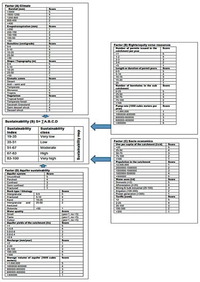 - D = Total score of the aquifer sustainability factor (Factor D)