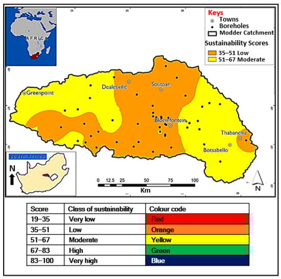 The created sustainability index was applied to 52 boreholes in the Modder River catchment of South Africa. ArcView GIS (version 8, Esri, Redlands, CA, USA) was used in demonstrating the results for each of the 52 boreholes towards the groundwater sustainability concept. The results show that 9 boreholes are sustainable, implying that they are reasonably maintainable, while 43 boreholes have low sustainability scores, which indicates that they are not viable.