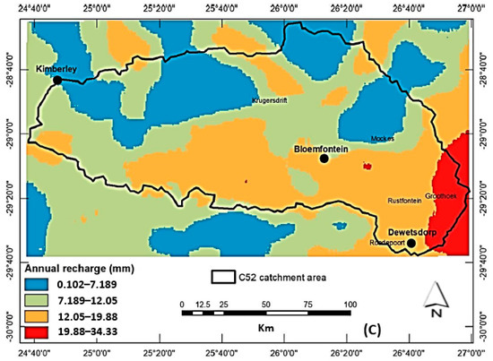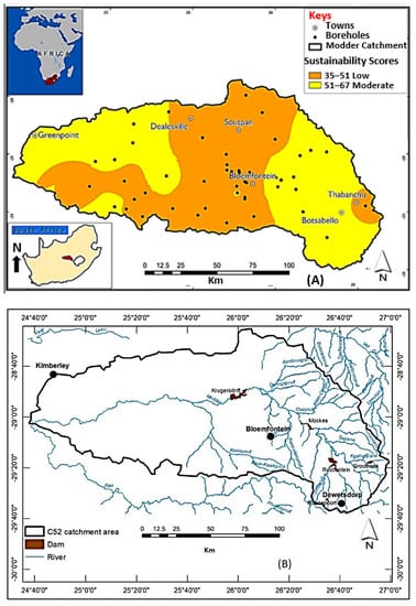Groundwater typically forms through the concept of recharge. Surface water and rainfall form most of the groundwater recharge. Precipitation that infiltrates and percolates the earth’s surface has three paths: (1) Capillary action forcing water into the vadose zone, (2) high temperature causing evapotranspiration, and (3) infiltration and percolation contributing to the water table [1]. In the arid and semi-arid areas of South Africa, farmers and communities have merely a limited number of water provision points [2]. This increases the pressure on groundwater and has increased the number of wells and boreholes being drilled to access the groundwater needed for multiple purposes, particularly for agriculture and drinking water [3]. The limited resources of water provision have put undue pressure on aquifers, such as those in the C52 Modder River catchment [4]. The Modder River catchment is part of the broader Orange River system termed the C5 secondary catchment. The sub-catchment (Modder River) is termed the C52 catchment [4], which has the following drainage regions: C52G, C52H, C52J, C52B, C52A, C52E and C52F. The Modder-Riet River catchment is a combined system. C51 is termed the Riet catchment while C52 is the Modder River catchment. Both belong to the bigger Upper Orange catchment. The Orange catchment itself is further divided into the Upper and Lower Orange River system.
