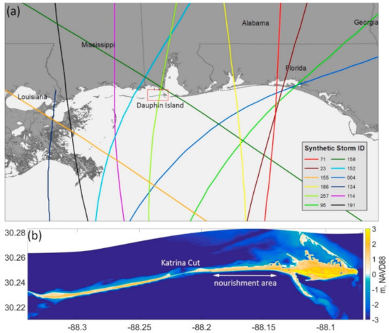 Figure 1. (a) Study area with synthetic storm tracks for a 30-year realization and (b) initial (Year 0) XBeach model bed level elevations (in meters, relative to NAVD88) at Dauphin Island. Base map layer in (a) provided by ESRI.