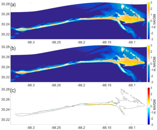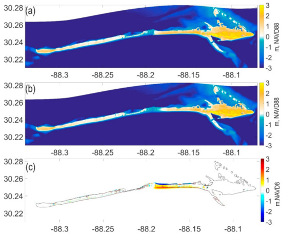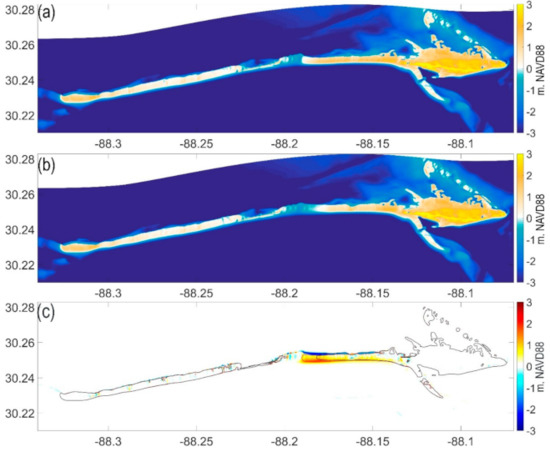 33. Passeri, D.L.; Bilskie, M.V.; Hagen, S.C.; Mickey, R.C.; Dalyander, P.S.; Gonzalez, V.M. Assessing the Effectiveness of Nourishment in Decadal Barrier Island Morphological Resilience: Model Inputs and Outputs; U.S. Geological Survey data release, 2021. [Google Scholar] [CrossRef]
