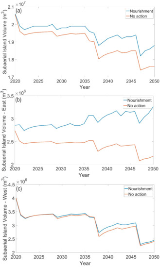 Figure 3. Subaerial island volume through the 30-year simulation across (a) the entire island and (b) east of Katrina Cut and (c) west of Katrina Cut under scenarios of nourishment and no-action.