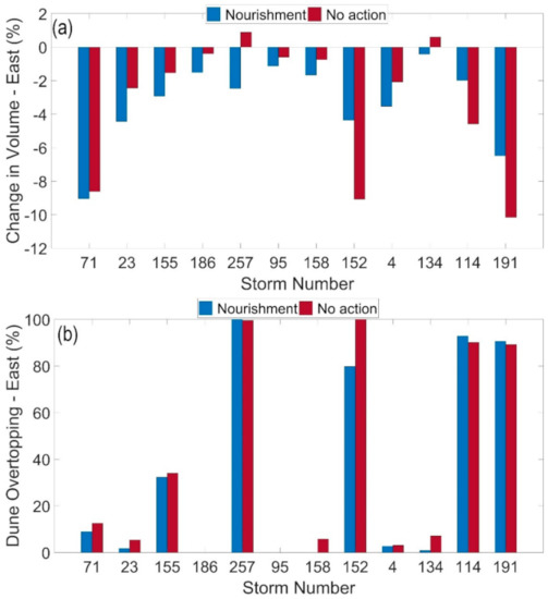 Figure 4. For each storm the (a) percent change in subaerial island volume east of Katrina Cut and (b) the percent of dunes overtopped east of Katrina Cut.