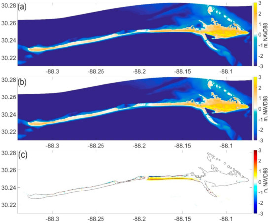 Figure 2. Modeled bed level elevations for (a) final (Year 30) nourishment scenario, (b) final (Year 30) no-action scenario and (c) difference between final nourishment scenario and no-action. In (c), the black line is the 0 m contour for final (Year 30) no-action scenario and the red line is the 0 m contour for the final (Year 30) nourishment scenario.