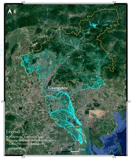 Surface waterbodies, including rivers, channels, ponds, lakes, and reservoirs, play an essential role in socioeconomic development and ecosystem balance, and provide irreplaceable natural resources for humans’ survival and development [1,2]. The waterbodies in Guangzhou City, an important central city in China with a permanent population of 15.31 million at the end of 2019, are under intensive pressure because of human activities (e.g., housing development, dredging, and agricultural pollution) or natural phenomena (e.g., extreme weather). To better understand waterbody changes and to allow comprehensive water-related studies and planning activities, such as water resource management and water disaster prevention, it is critical to conduct waterbody mapping [3].