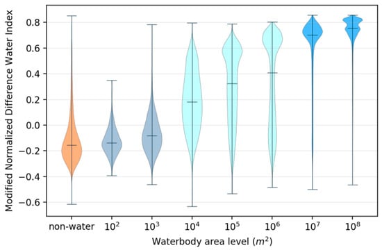The median value of MNDWI increased as the waterbody’s area increased; for non-water, it was −0.16. For small waterbodies, the two median values were −0.14 and −0.08, which were very close to that of the non-water areas. For medium waterbodies, the three median values were 0.18, 0.32, and 0.40, respectively. For large waterbodies, it was higher than 0.70.
