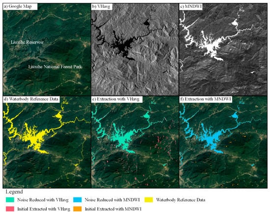 Figure 6 shows a typical case of mountain shadows denoising. The terrain in this area is quite undulating. For example, the altitude of the Liuxihe Reservoir is only 160 m. However, the altitude of the adjacent Liuxihe National Forest Park reaches 1000 m. In this case, the VHavg (Figure 6e) generated significantly more noises than MNDWI (Figure 6f). However, SAR is an active remote sensing device, which does not rely on sunlight. Moreover, SAR data are vulnerable to shadowing effects from steep mountains because of the side-looking viewing geometry of SAR satellite sensors [12].