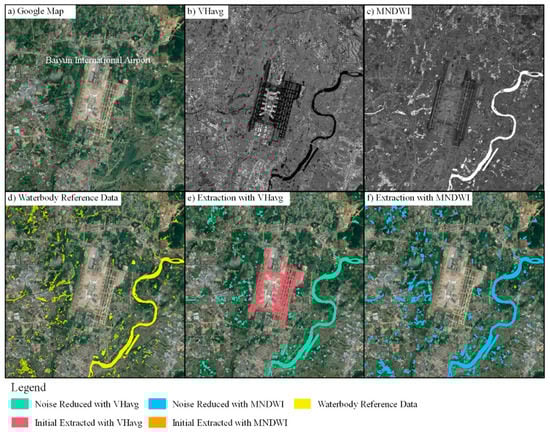 Figure 7 shows a typical case where the runway of Guangzhou Baiyun International Airport was misidentified as a waterbody using VHavg in initially extracted results and was then removed using flat surface removal by NDBI. There were similar noises, including viaducts, highways, playgrounds, and golf courses, that occurred in the results of VHavg. However, they did not appear in the results of MNDWI.