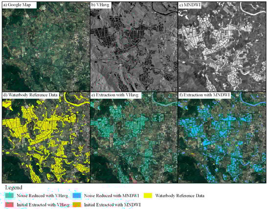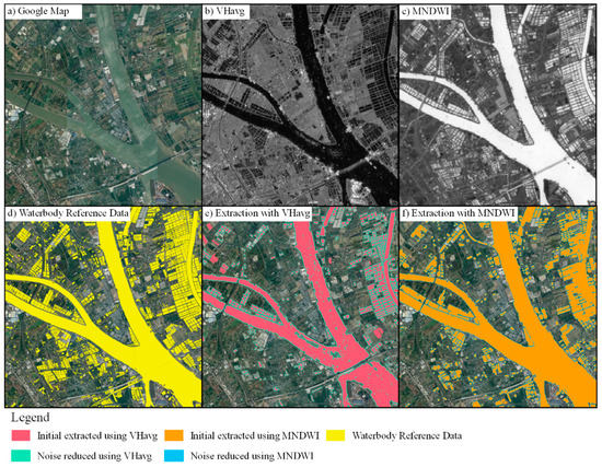 As a result, VHavg pixel values that were smaller than −24.56 or larger than −20.55 were marked as waterbodies/non-water areas. Similarly, the pixel value of MNDWI values larger than 0.55 or smaller than −0.05 was marked as waterbodies/non-water areas.