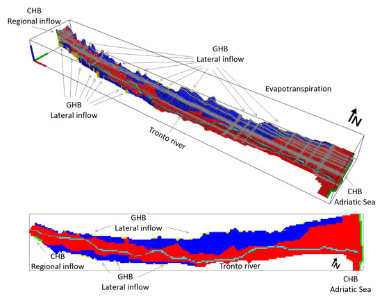 Three-dimensional sketch (upper panel) and plan view (lower panel) of the model grid discretization (grey lines) and the boundary conditions applied in the Tronto alluvial aquifer. The unconsolidated sandy gravel unit (red area) and the consolidated sandy gravel unit (blue area) are also represented. Vertical exaggeration 1:10.
