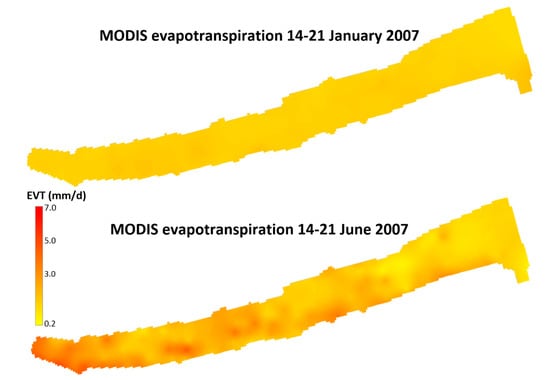 The CONSTANT HEAD BOUNDARY package (CHB) was used to represent the regional groundwater inflow boundary and the Adriatic Sea boundary. The inflow CHB was set using the hydrometric head of the Castellano stream (130 m asl in both January and June 2007 simulations), which is a major affluent of the Tronto river located near this boundary. The Castellano stream drains a fractured aquifer structure which provides a constant baseflow to the Castellano stream [37]. The RIVER package (RIV) was employed to simulate the Tronto river; the GENERAL HEAD BOUNDARY package (GHB) was used to represent the lateral groundwater flow from ephemeral Tronto effluents; and the WELL package (WEL) was used to simulate the pumping rate of the principal wells present in the alluvial aquifer with a known pumping rate. The information on pumping wells was collected from the Regional Basin Authority, which created a land registry with location, depth, and radius of each well, and declared pumping rate; here, only pumping wells with a continuous pumping rate of more than 5.0 L/s were included in the model (16 wells). The EVAPOTRANSPIRATION package (EVT) was used to simulate the evapotranspiration from groundwater, with the evapotranspiration rate derived from the Moderate Resolution Imaging Spectroradiometer (MODIS) dataset. The algorithm used for the MOD16 data product collection is based on the logic of the Penman–Monteith equation [38], which includes inputs of daily meteorological reanalysis data and MODIS remotely sensed data products, such as vegetation property dynamics, albedo, and land cover [39]. The MOD16A2 Version 6 Total Evapotranspiration product is an 8-day composite dataset produced at 500 m pixel resolution. The data were download from the MOD16A2GF model [38] using the AppEARS interface [40] and further converted into point features to allow a proper spatial distribution of the study area through the application of kriging interpolation [41] over the model grid. (Figure 3). The extinction depth of evapotranspiration for June 2007 was set to 1.5 m below ground level because this is the suggested value for cropped fields in permeable soils [12]. For January 2007, extinction depth was set to 0.9 m below ground level because only evaporation played a role given that in wintertime the soils are generally uncropped, and the transpiration of plants is basal [42].