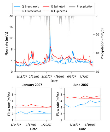 The daily average discharge and precipitation from January to July 2007 is plotted in Figure 6 for both the Brecciarolo (in blue) and Spinetoli (in red) gauging stations. The surface runoff–baseflow separation line, obtained from the BFI-software application, is shown with lighter colors at both river cross-sections. In addition to the hydropeaking fluctuations induced by upstream-located hydropower plants [51], the maximum flow peak occurs in the first half of April, promoted by a significant and intense precipitation (more than 30 mm/day), as shown by the downward-pointing gray lines. Further relevant flow peaks are due to milder but persistent precipitations at the end of January and the beginning of March. It is worth noting that the baseflow contribution at the downstream location (light red) is larger than at the upstream section (light blue) most of the time, mainly in spring and summer (April and July), probably due to the important role of the tributaries feeding the Tronto river between the analyzed stations. Further, just after the April rainfall and compared to the upstream section, a greater groundwater recharge and reduced surface contribution occurred at the downstream section. Focusing on the weeks under analysis, small flow rates were recorded at both stations, with flow rates around 2–3 m3/s in January (lower left panel) and 3–5 m3/s in June (lower right panel).