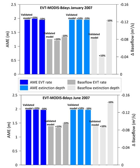 Sensitivity analysis results of ±10% perturbations on evapotranspiration rate and extinction depth for the EVT-MODIS-8days January 2007 model (upper panel) and for the EVT-MODIS-8days June 2007 model (lower panel).