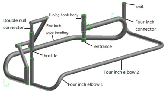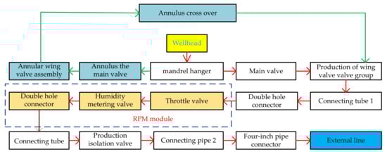 The main components of the subsea tree are shown in Figure 1. The H-4 connector is used to connect the subsea tree body to the wellhead. The tubing is mounted on the subsea tree body and communicates with the main production valve and the subsea tree body’s annular main valve. The vertical center hole of the tubing hanger is sealed with a center plug. On the upper part of the tubing hang is a built-in tree cap. On the upper part of the built-in tree cap is a garbage cap; its function is to prevent sediment from falling into it. The annular main valve in the subsea tree body is connected to the annular wing valve, connected to the annular span nozzle. Both the annulus spanning nozzles and the subsea tree body’s main production valves are connected to the production wing valve sets. The production wing valve set is connected to the two-hole connector inlet through the reducer (51/8″ to 41/16″) to the throttle valve in the reservoir performance monitor(RPM) module and then flows back to the outlet of the two-hole connector through the production isolation valve (PIV) to connect the 4 inch pipe connector through the connecting pipe 2.
