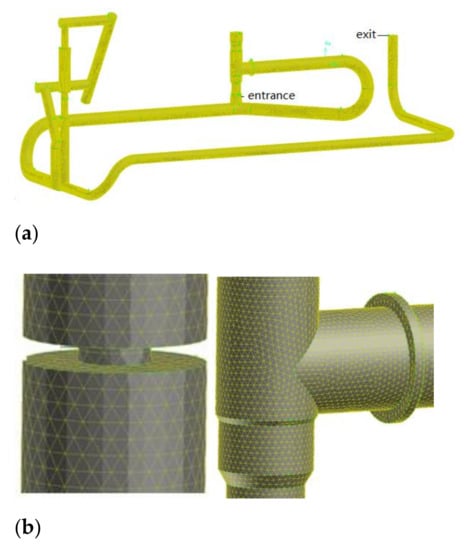 The mesh wasdivided in GAMBIT, and the fluid domain wasdivided into 2,381,521 tetrahedral elements. Figure 4a is the overall schematic diagram of meshing. Figure 4b is a partially enlarged view of the grid division. It can be seen from the local enlarged image that the mesh division of the flow field is dense, neat and uniform, and the mesh division can meet the requirements of numerical simulation.