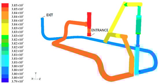 Figure 5 shows the pressure cloud diagram of the subsea tree’s overall flow field under working condition 1. The maximum pressure wasconcentrated before the throttle valve; this is because of the throttle valve that the pressure increases. The minimum pressure was 3.8 MPa concentrated between the metering valve and the outlet. It can be seen from the figure above that the pressure decreased from the inlet to the outlet. In the straight pipe, the pressure does not change much. At the bend and the diameter—especially at the right-angle bend—the pressure changed, possibly due to turbulence, but the pressure changed little from the inlet to the subsea tree’s outlet. As can be seen from the diagram, the whole tree fluid pressure presented three obvious changes. This was due to the fluid through the throttle valve and the metering valve interfering with decreasing the stress transfer. After the valve sets the pressure in a stable state, this way of easily decreasing the pass pressure is not stable, so it is prone to vibration and measurement at the throttle valve.