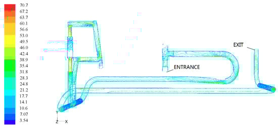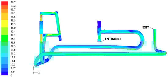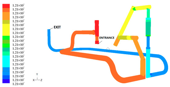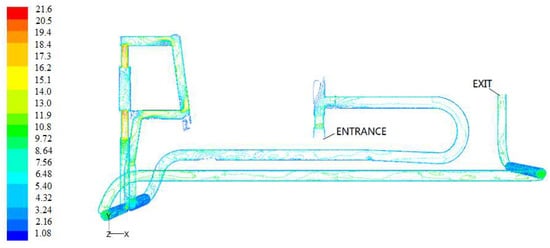 Figure 9 shows the velocity cloud diagram of the overall flow field of the structure under working condition 2. The maximum velocity in the fluid domain was smaller than that in working condition 1 due to pressure difference and was similar to the flow field analysis results of the tree body. As can be seen from the figure above, most of the fluid was in a low-velocity state. Figure 10 shows the velocity contour of working condition 2. At the straight pipe, the streamline was relatively uniform without turbulence, while at the bend and the variable diameter, especially at the right-angle turn, the streamline became disorderly, and turbulence may occur.