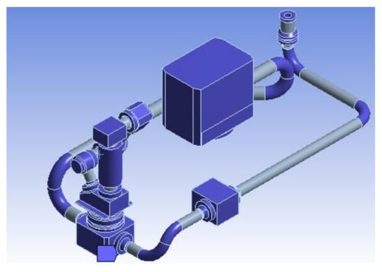 The overall simplified subsea tree model consisted of two parts: the fluid domain and the solid domain. Then the model in Fluent and Transient Structural was shared to complete the geometric matching of the flow field and the solid. An automatic method mixed with tetrahedron and hexahedron elements was selected to establish the boundary surface of the fluid domain, including the entrance and exit surface and wall surface. The system coupling module was combined with the Fluent and Transient Structural modules to establish the model of the whole subsea tree system, as shown in Figure 11.