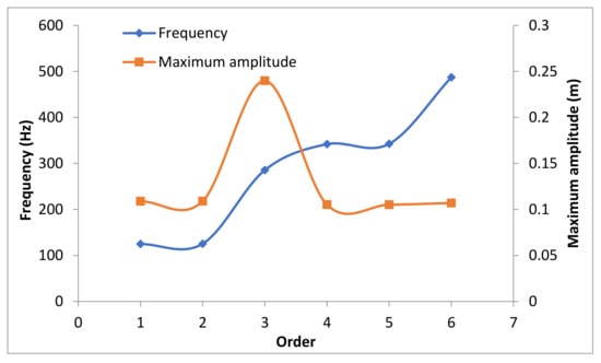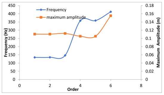 Through modal analysis, we can understand the subsea tree’s dynamic response under different load conditions, which can prevent the subsea tree from resonating or vibrating at a specific frequency in the actual working environment, and it is also conducive to control in the actual working environment. The overall modal analysis of the underwater subsea treeusedatwo-way fluid–solid coupling method. The fluid pressure calculated by this method wastransferred to the static structural module as a load item. The gravity field, external pressure and the variable diameter were added in the static structural fix constraints at the position, the right-angle elbow and the connecting device, and then the calculation time and the number of steps were set. Finally, the result calculated by Static Structuralwastransferred to the subsea tree module as a load term, and the first six modes of the structure weretaken to calculate its frequency mode under two working conditions, as shown in Figure 12 and Figure 13.