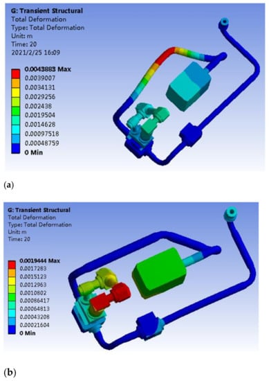 The temperature results calculated above were added as a load item to the Transient Structural to calculate the effect of temperature on the structure. The subsea tree structure displacement was calculated after setting the calculation time and the number of steps. The displacement cloud diagrams under the two working conditions are shown in Figure 15a,b.