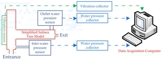 In this section, the subsea tree experiment was designed and carried out. The subsea tree model was simplified to a trigeminal pipeline similar to the fluid domain of the subsea tree body, and the flow field characteristics and modal modes under the action of fluid–solid coupling were studied. Specifically, a simplified subsea tree model was designed. The schematic diagram of the experiment is shown in Figure 16. The main experimental equipment included a water pressure sensor, vibration sensor, water pressure collector, and 24 V power supply. The 24 V power supply was used to provide voltage to the smart meter for measuring water pressure. The water pressure sensor was used to measure the water pressure at the inlet and outlet of the trigeminal pipe. The vibration sensor used advanced digital filtering technology, which could effectively reduce external interference and improve the accuracy of measurement. The water pressure collector wasused to convert the analog water pressure signal of the water pressure sensor into a digital signal.