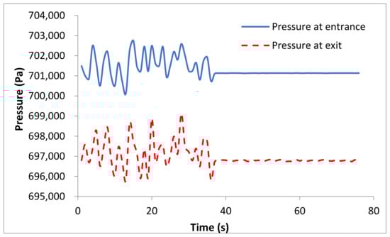 After the experiment of the simplified Subsea tree model was completed, the collected data were analyzed. It can be seen that the water pressure at the entrance was unstable at the beginning and then stabilized in Figure 19. The entrance pressure stabilized around 0.701 Mpa, and the exit pressure stabilized around 0.697 Mpa. Because the model built by the numerical simulation wassimplified, and there wasan error between the actual trigeminal pipeline and the pipeline in the boundary conditions set by the numerical simulation model, so the numerical simulation and the actual data weredifferent, but it waswithin a reasonable range.