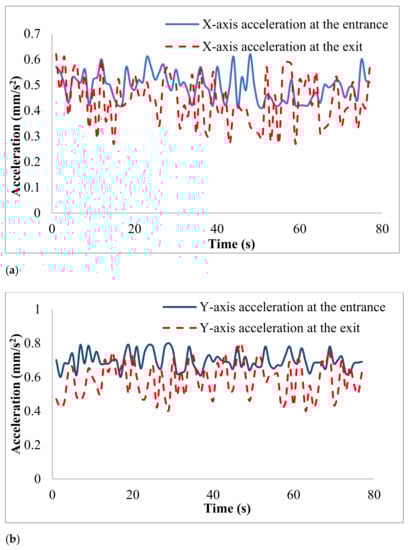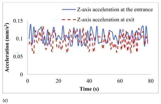 Comparison of acceleration in each direction of entrance and exit. (a) x-axis acceleration; (b) y-axis acceleration; (c) z-axis acceleration.
