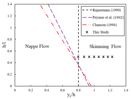 Flow regimes over the spillways are divided into three types, nappe, transition, and skimming flow [5], as indicated in Figure 1.