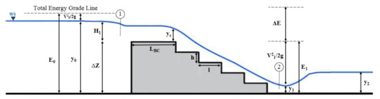 According to the notations in Figure 3, the critical depth (yc) lies at the beginning and on the first step (yc = (Q/W)2/g1/3). In this case, Q (m3/s) is the discharge, W (m) the channel width, and g (m/s2) is the acceleration of gravity. On the other hand, the following equations can be used to obtain the total water energy upstream, downstream and energy dissipation of the spillway: