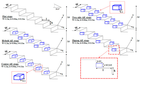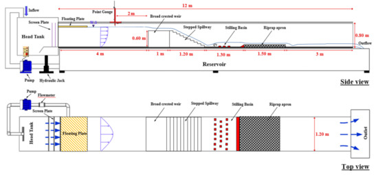 According to Figure 4, the tests were carried out in a rectangular flume with a length of 12 m, a width of 1.2 m, and a height of 0.8 m. The flume had glass walls (to improve flow visibility and reduce friction) and a steel floor. With plexiglass, the influence of sidewall effects is considered to be negligible (see Johnson [32] and Ghaderi et al. [33]). The slope of the flume is adjustable by a hydraulic jack; however, for this study, the slope was set to zero for all experiments. Flow in the flume was supplied by a pump with a maximum capacity of 55 l/s and was pumped into the flume’s head tank through a polyethylene pipe with a diameter of 0.2 m. The flow discharge entering the pump could be adjustable by a butterfly valve from the main tank. An ultrasonic flow meter with the precision of ±1 l⁄s was used on the transmission pipe to measure the discharge. Next to the head tank, two screen plates were used for flow relaxation, and also one floating Styrofoam plate fixed along with the flow was used to reduce water level fluctuations. The experiments were conducted on a stepped spillway with a slope of 26.60° and consisted of 10 steps with step length (l) and height (h) 0.06 and 0.12 m, respectively. The tests encompassed two stepped spillway configurations, flat steps, appendance elements (AE) on steps with four cases in various arrangements (Figure 5). The center appendance elements and two side appendance elements lengths were W/2 = 0.6 m and W/3 = 0.4 m, respectively. The water flow depths upstream the broad-crested models and downstream the hydraulic jumps were measured using pointer gauges with 1 mm accuracy. The first, upstream, point gauge was located at 3∆Z to 4∆Z upstream of the models [34,35,36,37]. The second point gauge, located downstream of the hydraulic jumps, was used to measure the sequent depths of the hydraulic jumps. The flow was controlled by a broad-crested weir with height P = 0.6 m, width W = 1.2 m, and length of LBC = 1 m, with the following equation by Felder and Chanson [12]: